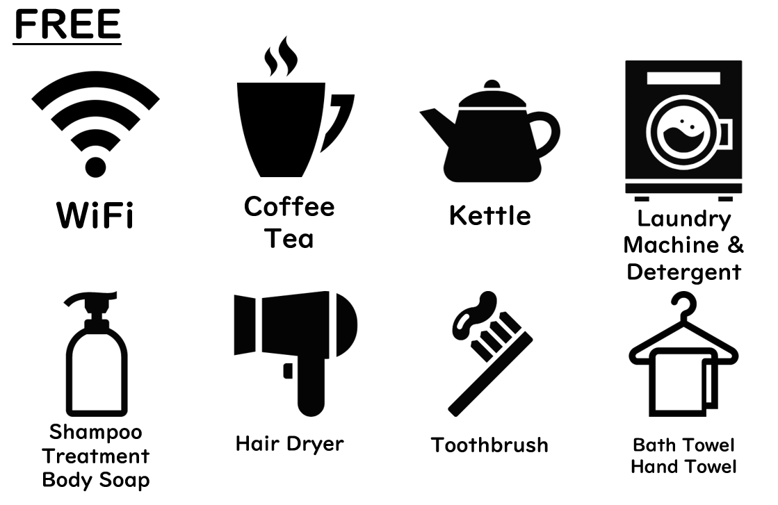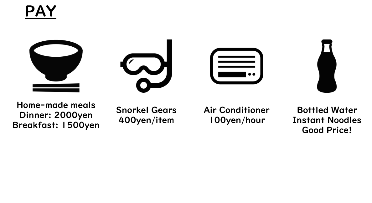 There is all you need during your stay: Free WiFi, Meals, Rental snorkeling gears, Amenity, etc…